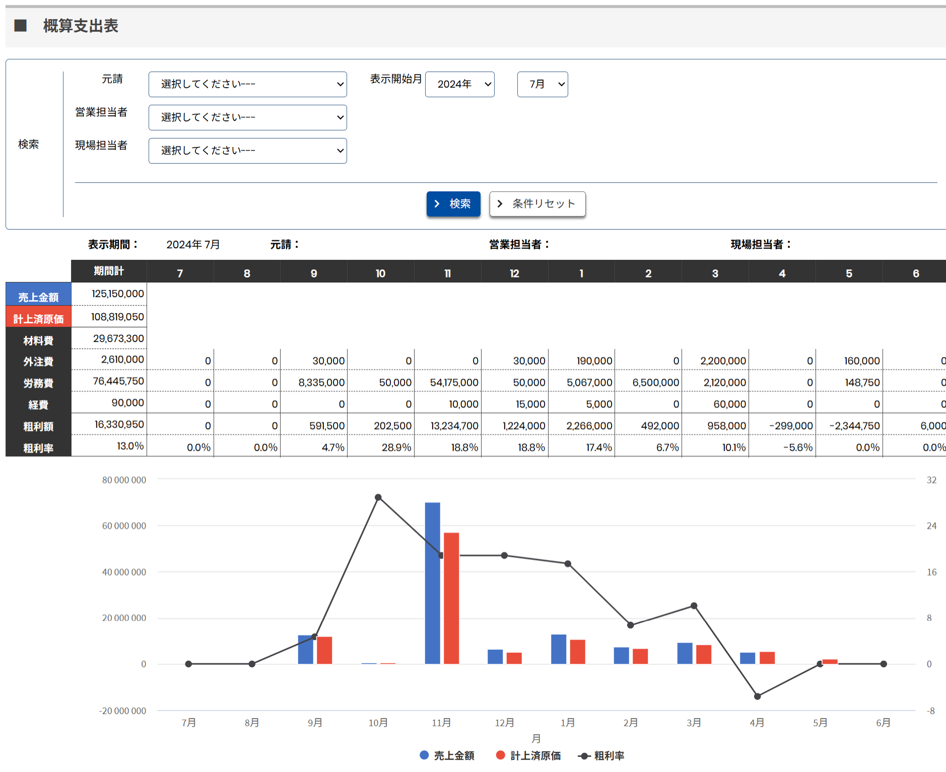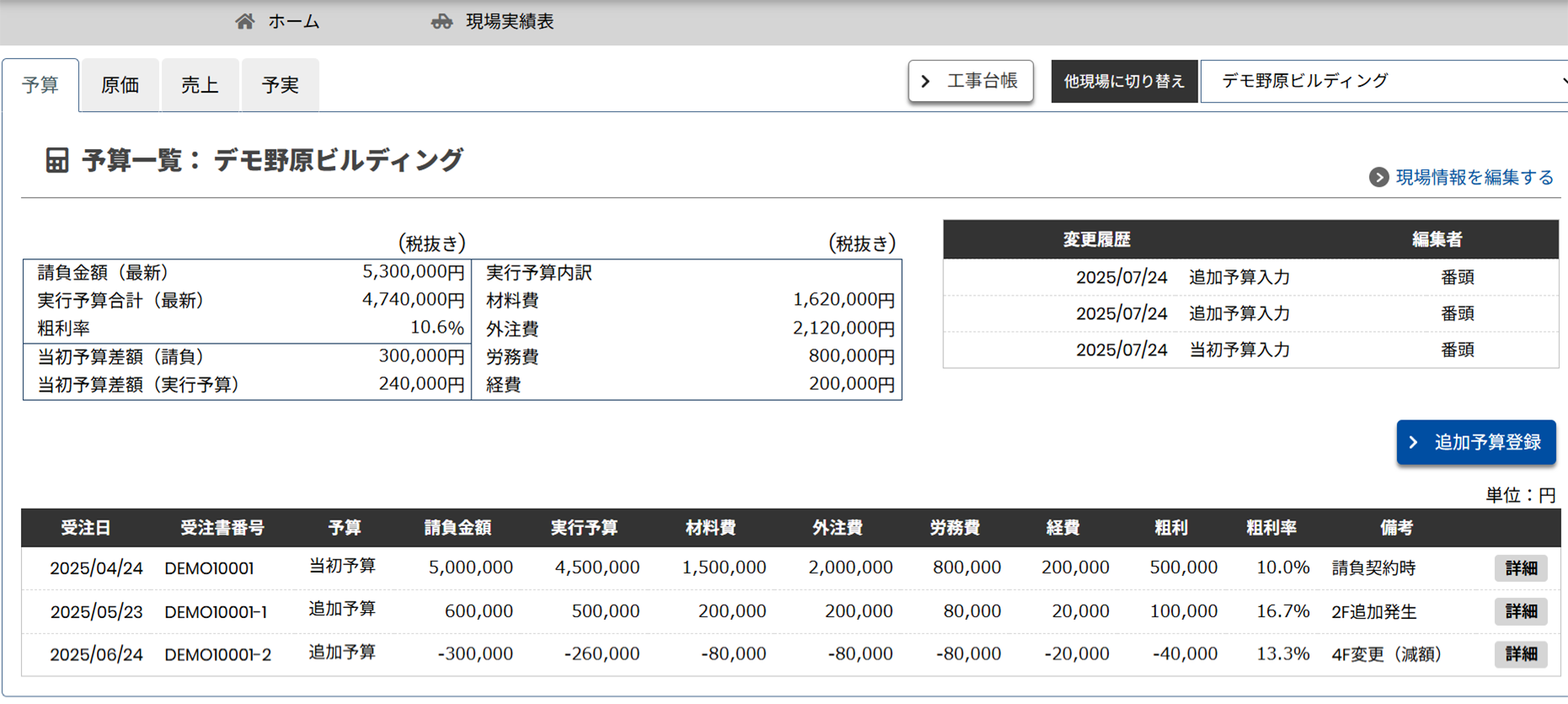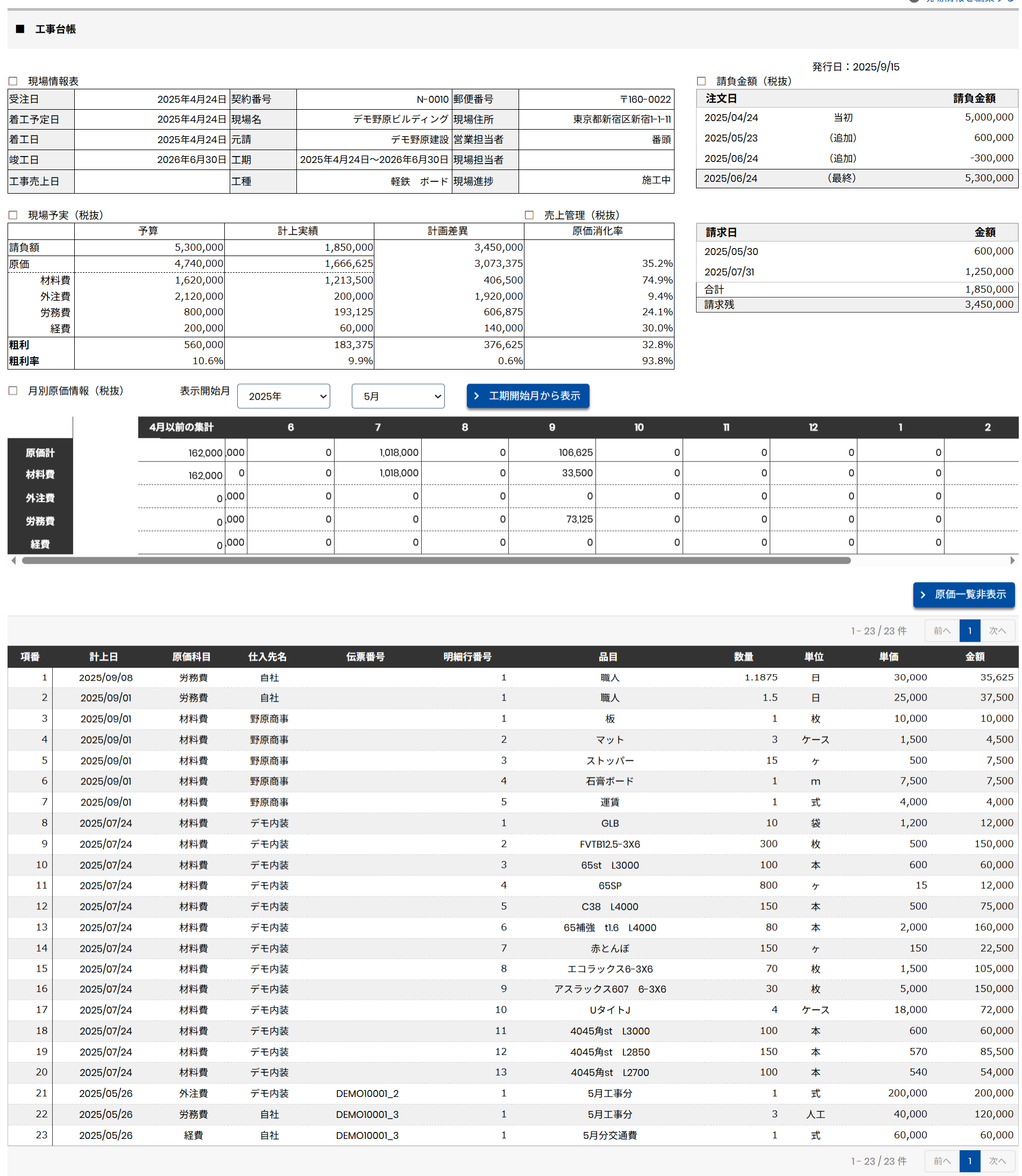 現場の原価・粗利額・粗利率・進捗も簡単に確認でき、内装工事会社様の経営をサポートします。