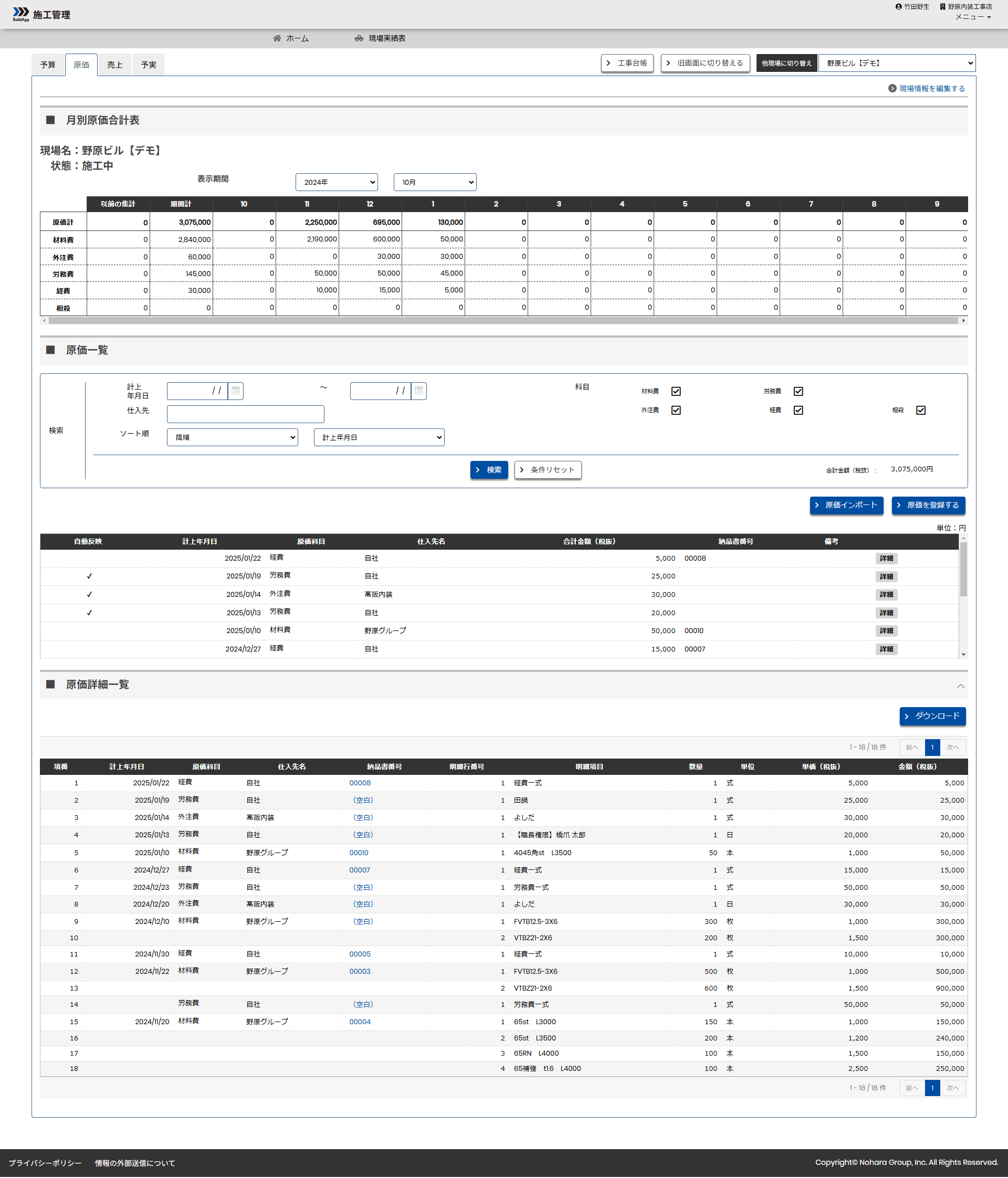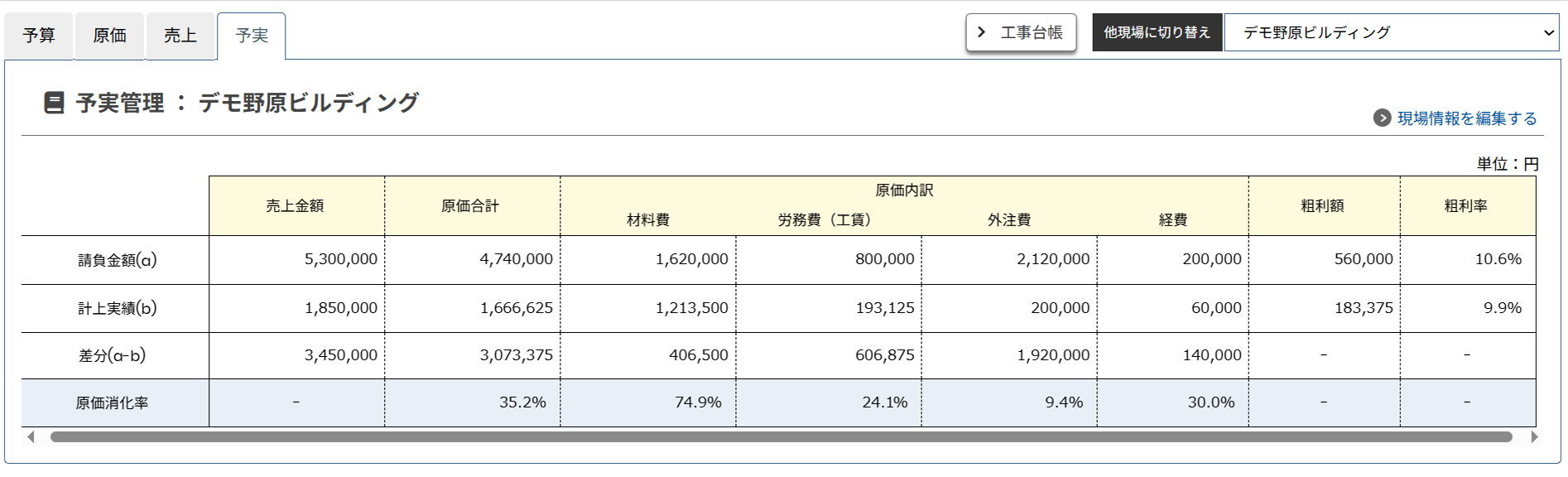 原価は「材料費・労務費・外注費・経費」の科目ごとに表示され、実行予算との差分や、科目ごとの予算消化率から、進捗や異変を確認できます。